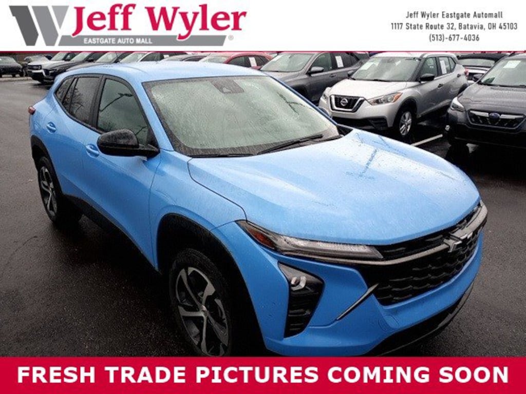 Jeff Wyler Eastgate Auto Mall is excited to offer this fantastic-looking 2024 Chevrolet Trax 1RS in Fountain Blue. Well equipped with: Preferred Equipment Group 1RS, 2-Way Adjustable Front Head Restraints, 3.50 Final Drive Axle Ratio, 4 Speakers, 4-Speaker Audio System Feature, 4-Way Manual Front Passenger Seat Adjuster, 4-Wheel Disc Brakes, 6-Way Manual Driver Seat Adjuster, ABS brakes, Air Conditioning, Alloy wheels, AM/FM radio: SiriusXM, Auto High-beam Headlights, Brake assist, Bumpers: body-color, Cloth Seat Trim, Compass, Delay-off headlights, Driver door bin, Driver vanity mirror, Dual front impact airbags, Dual front side impact airbags, Electronic Stability Control, Emergency communication system: OnStar and Chevrolet connected services capable, Exterior Parking Camera Rear, Front anti-roll bar, Front Bucket Seats, Front Center Armrest, Front reading lights, Front wheel independent suspension, Fully automatic headlights, Heated door mirrors, Heated Driver & Front Passenger Seats, Heated front seats, Heated steering wheel, Illuminated entry, Low tire pressure warning, Occupant sensing airbag, Outside temperature display, Overhead airbag, Overhead console, Panic alarm, Passenger door bin, Passenger vanity mirror, Power door mirrors, Power steering, Power windows, Premium audio system: Chevrolet Infotainment 3, Radio data system, Radio: Chevrolet Infotainment 3 System w/AM/FM, Rear window defroster, Rear window wiper, Remote keyless entry, Security system, SiriusXM, Speed control, Split folding rear seat, Spoiler, Sport steering wheel, Steering wheel mounted audio controls, Tachometer, Telescoping steering wheel, Tilt steering wheel, Traction control, Trip computer, Variably intermittent wipers, and Wheels: 18" Black-Painted Machined Aluminum. CARFAX One-Owner. Clean CARFAX. Awards: * Car and Driver 10 BestCar and Driver, January 2017. Ask about available certifications. Used vehicles 10 years of age or newer with less than 100,000 miles are eligible for the Wyler Assurance Program, but eligible vehicles must pass our reconditioning process and multi-point inspection. Provided the vehicle passes inspection, vehicles will be eligible for the 6 month/6,000 mile limited warranty. The 6 month/6,000 mile limited warranty is NOT available on AS-IS vehicles, wholesale vehicles, lease buyback/pass-thru vehicles or un-inspected vehicles. Note that this program can also apply to vehicles where the remaining factory coverage is less than 6 months or 6,000 miles. Please check the Federal Trade Commission (FTC) Buyers guide on the vehicle for full details as to whether or not warranty coverage may apply. Contact Dealer for additional details. The Wyler Assurance 6 month/6,000 Mile limited warranty ends 6 months from the date of the Retail Purchase Agreement (BUYERS ORDER) or when the vehicle's odometer registers 6,000 additional miles to the mileage listed on the BUYERS ORDER, whichever comes first. Your Deductible - The warranty holder on your contract pays the first $100 of each covered repair.