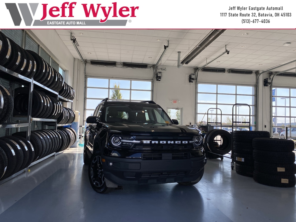 Jeff Wyler Eastgate Auto Mall is delighted to offer this superb 2024 Ford Bronco Sport Outer Banks in Shadow Black. Well equipped with: Equipment Group 300A, Ford Co-Pilot360 Assist+ (Evasive Steering Assist, Intelligent Adaptive Cruise Control w/Stop & Go, and Voice-Activated Touchscreen Navigation System), Tech Package (HD Radio, Universal Garage Door Opener (UGDO), and Wireless Charging Pad), 3.80 Axle Ratio, 4-Wheel Disc Brakes, 6 Speakers, ABS brakes, Air Conditioning, Alloy wheels, AM/FM radio: SiriusXM, AM/FM Stereo, Auto High-beam Headlights, Auto-dimming Rear-View mirror, Automatic temperature control, Brake assist, Cargo Management System, Cargo Mat, Compass, Delay-off headlights, Driver door bin, Driver vanity mirror, Dual front impact airbags, Dual front side impact airbags, Electronic Stability Control, Emergency communication system: SYNC 3 911 Assist, Four wheel independent suspension, Front anti-roll bar, Front Bucket Seats, Front Center Armrest, Front dual zone A/C, Front fog lights, Front License Plate Bracket, Front reading lights, Fully automatic headlights, Heated door mirrors, Heated front seats, Heated steering wheel, Illuminated entry, Knee airbag, Low tire pressure warning, Memory seat, Occupant sensing airbag, Outside temperature display, Overhead airbag, Overhead console, Panic alarm, Passenger door bin, Passenger vanity mirror, Power door mirrors, Power driver seat, Power Moonroof, Power passenger seat, Power steering, Power windows, Premium-Trimmed Heated Sport Contour Bucket Seats, Radio data system, Rain sensing wipers, Rear anti-roll bar, Rear Parking Sensors, Rear reading lights, Rear seat center armrest, Rear window defroster, Rear window wiper, Remote keyless entry, Security system, SiriusXM, Speed control, Speed-sensing steering, Speed-Sensitive Wipers, Split folding rear seat, Steering wheel mounted audio controls, SYNC 3 Communications & Entertainment System, Tachometer, Telescoping steering wheel, Tilt steering wheel, Traction control, Trip computer, Variably intermittent wipers, and Wheels: 18" Ebony Black-Painted Aluminum. Ask about available certifications. Used vehicles 10 years of age or newer with less than 100,000 miles are eligible for the Wyler Assurance Program, but eligible vehicles must pass our reconditioning process and multi-point inspection. Provided the vehicle passes inspection, vehicles will be eligible for the 6 month/6,000 mile limited warranty. The 6 month/6,000 mile limited warranty is NOT available on AS-IS vehicles, wholesale vehicles, lease buyback/pass-thru vehicles or un-inspected vehicles. Note that this program can also apply to vehicles where the remaining factory coverage is less than 6 months or 6,000 miles. Please check the Federal Trade Commission (FTC) Buyers guide on the vehicle for full details as to whether or not warranty coverage may apply. Contact Dealer for additional details. The Wyler Assurance 6 month/6,000 Mile limited warranty ends 6 months from the date of the Retail Purchase Agreement (BUYERS ORDER) or when the vehicle's odometer registers 6,000 additional miles to the mileage listed on the BUYERS ORDER, whichever comes first. Your Deductible - The warranty holder on your contract pays the first $100 of each covered repair.
