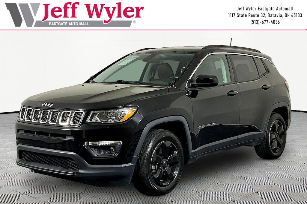 Jeff Wyler Eastgate Auto Mall is delighted to offer this beautiful 2019 Jeep Compass Latitude in Diamond Black Crystal Pearlcoat. Well equipped with: MOPAR Interior Protection Package (MOPAR All-Weather Floor Mats and MOPAR Molded Cargo Tray), Quick Order Package 28J, 3.502 Axle Ratio, 4-Wheel Disc Brakes, 6 Speakers, ABS brakes, Air Conditioning, Alloy wheels, AM/FM radio, Anti-whiplash front head restraints, Automatic temperature control, Bluetooth® Streaming Audio, Brake assist, Bumpers: body-color, Compass, Delay-off headlights, Driver door bin, Driver vanity mirror, Dual front impact airbags, Dual front side impact airbags, Electronic Stability Control, Four wheel independent suspension, Front anti-roll bar, Front Bucket Seats, Front Center Armrest w/Storage, Front dual zone A/C, Front fog lights, Front reading lights, Fully automatic headlights, Heated door mirrors, Illuminated entry, Knee airbag, Leather Shift Knob, Low tire pressure warning, Media Hub (USB, AUX), Occupant sensing airbag, Outside temperature display, Overhead airbag, Overhead console, Panic alarm, ParkView Rear Back-Up Camera, Passenger door bin, Passenger vanity mirror, Power door mirrors, Power steering, Power windows, Premium Cloth/Vinyl Bucket Seats, Radio: Uconnect 4 w/7" Display, Rear anti-roll bar, Rear seat center armrest, Rear window defroster, Rear window wiper, Remote keyless entry, Roof rack: rails only, Speed control, Split folding rear seat, Spoiler, Steering wheel mounted audio controls, Tachometer, Telescoping steering wheel, Tilt steering wheel, Traction control, Trip computer, Variably intermittent wipers, and Wheels: 17" x 7.0" Silver Painted Aluminum. Ask about available certifications. Used vehicles 10 years of age or newer with less than 100,000 miles are eligible for the Wyler Assurance Program, but eligible vehicles must pass our reconditioning process and multi-point inspection. Provided the vehicle passes inspection, vehicles will be eligible for the 6 month/6,000 mile limited warranty. The 6 month/6,000 mile limited warranty is NOT available on AS-IS vehicles, wholesale vehicles, lease buyback/pass-thru vehicles or un-inspected vehicles. Note that this program can also apply to vehicles where the remaining factory coverage is less than 6 months or 6,000 miles. Please check the Federal Trade Commission (FTC) Buyers guide on the vehicle for full details as to whether or not warranty coverage may apply. Contact Dealer for additional details. The Wyler Assurance 6 month/6,000 Mile limited warranty ends 6 months from the date of the Retail Purchase Agreement (BUYERS ORDER) or when the vehicle's odometer registers 6,000 additional miles to the mileage listed on the BUYERS ORDER, whichever comes first. Your Deductible - The warranty holder on your contract pays the first $100 of each covered repair.