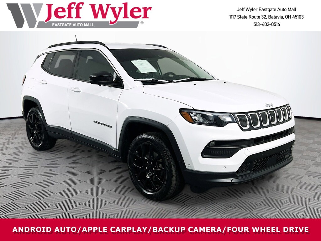 Jeff Wyler Eastgate Auto Mall is delighted to offer this good-looking 2022 Jeep Compass Latitude Lux in Bright White Clearcoat. Well equipped with: Lux Driver Assist (115V Auxiliary Power Outlet, 2nd Row USB Type A/C Charge Only, 360 Surround View Camera System, Adaptive Cruise Control w/Stop & Go, Air Conditioning ATC w/Dual Zone Control, All-Season Floor Mats, Foot Activated Open 'N Go Liftgate, Humidity Sensor, P&P Park & Unpark Assist System, ParkSense Fr/Rr Park Assist System, Power Liftgate, Premium LED Fog Lamps, Rain Sensitive/Intermittent Wipers, Reversible Carpet/Vinyl Cargo Mat, Universal Garage Door Opener, Windshield Wiper De-Icer, and Wireless Charging Pad), Quick Order Package 2GL, 3.73 Axle Ratio, 4-Wheel Disc Brakes, 6 Speakers, ABS brakes, Air Conditioning, Alloy wheels, AM/FM radio: SiriusXM, Anti-whiplash front head restraints, Auto High-beam Headlights, Auto-dimming Rear-View mirror, Brake assist, Bumpers: body-color, Compass, Delay-off headlights, Driver door bin, Driver vanity mirror, Dual front impact airbags, Dual front side impact airbags, Electronic Stability Control, Emergency communication system: SiriusXM Guardian, Four wheel independent suspension, Front anti-roll bar, Front Bucket Seats, Front Center Armrest w/Storage, Front fog lights, Front License Plate Bracket, Front reading lights, Fully automatic headlights, Heated door mirrors, Heated front seats, Heated steering wheel, Illuminated entry, Knee airbag, Leather Shift Knob, Leather Trimmed Bucket Seats, Low tire pressure warning, Occupant sensing airbag, Outside temperature display, Overhead airbag, Overhead console, Panic alarm, ParkView Rear Back-Up Camera, Passenger door bin, Passenger vanity mirror, Power door mirrors, Power driver seat, Power steering, Power windows, Radio: Uconnect 5 w/10.1" Display, Rear anti-roll bar, Rear seat center armrest, Rear window defroster, Rear window wiper, Remote keyless entry, Roof rack: rails only, Security system, Speed control, Split folding rear seat, Spoiler, Steering wheel mounted audio controls, Tachometer, Telescoping steering wheel, Tilt steering wheel, Traction control, Trip computer, Variably intermittent wipers, and Wheels: 18" x 7.0" Painted Aluminum. CARFAX One-Owner. Ask about available certifications. Used vehicles 10 years of age or newer with less than 100,000 miles are eligible for the Wyler Assurance Program, but eligible vehicles must pass our reconditioning process and multi-point inspection. Provided the vehicle passes inspection, vehicles will be eligible for the 6 month/6,000 mile limited warranty. The 6 month/6,000 mile limited warranty is NOT available on AS-IS vehicles, wholesale vehicles, lease buyback/pass-thru vehicles or un-inspected vehicles. Note that this program can also apply to vehicles where the remaining factory coverage is less than 6 months or 6,000 miles. Please check the Federal Trade Commission (FTC) Buyers guide on the vehicle for full details as to whether or not warranty coverage may apply. Contact Dealer for additional details. The Wyler Assurance 6 month/6,000 Mile limited warranty ends 6 months from the date of the Retail Purchase Agreement (BUYERS ORDER) or when the vehicle's odometer registers 6,000 additional miles to the mileage listed on the BUYERS ORDER, whichever comes first. Your Deductible - The warranty holder on your contract pays the first $100 of each covered repair.